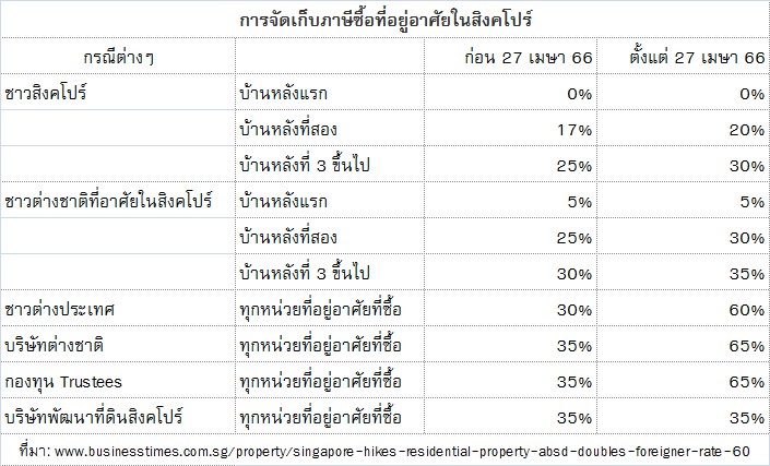 ดร.โสภณ พรโชคชัย ประธาน ศูนย์ข้อมูลวิจัยและประเมินค่าอสังหาริมทรัพย์ไทย บจก.เอเจนซี่ ฟอร์ เรียลเอสเตท แอฟแฟร์ส (www.area.co.th) กล่าวว่าจากรายงานข่าวของสำนักข่าวต่างประเทศหลายแห่ง รายงานตรงกันว่า สิงคโปร์กำหนดภาษีซื้อของชาวต่างชาติใหม่ จากเดิม 30% เป็น 60% แล้ว เพื่อป้องกันการซื้ออสังหาริมทรัพย์ของชาวต่างชาติ ป้องกันการผูกขาดโดยชาวต่างชาติ และพิทักษ์ผลประโยชน์ของประเทศชาติและประชาชนชาวสิงคโปร์ ทั้งนี้มาตรการดังกล่าว เริ่มในวันที่ 27 เมษายน 2566 นี้
