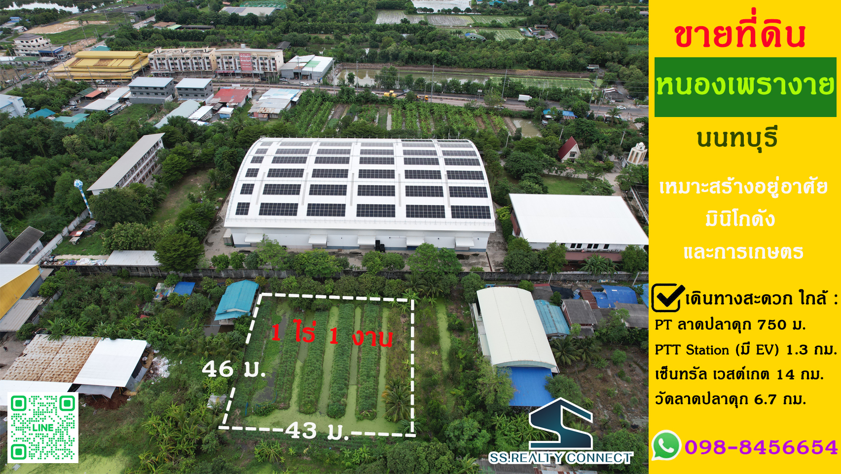 ทำเล : ต.หนองเพรางาย อ.ไทรน้อย จ.นนทบุรีเนื้อที่ : 1 ไร่ 1 งาน (500 ตร.ว.)รูปแปลง : สี่เหลี่ยมสวย กว้าง 43 ม. x ลึก 46 ม.ผังเมือง : สีเขียว ก.2-11
